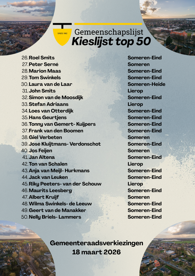 De Gemeenschapslijst-Someren presenteert voor het eerst haar volledige kieslijst voor de gemeenteraadsverkiezingen die 18 maart 2026 plaatsvinden. De lijst bestaat uit een diverse mix van alle leeftijden en kernen die alle inwoners van heel de gemeente Someren moet vertegenwoordigen.