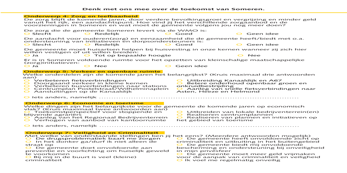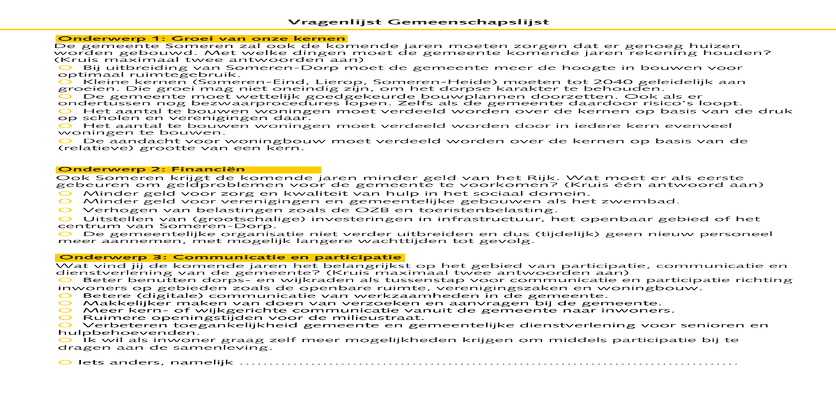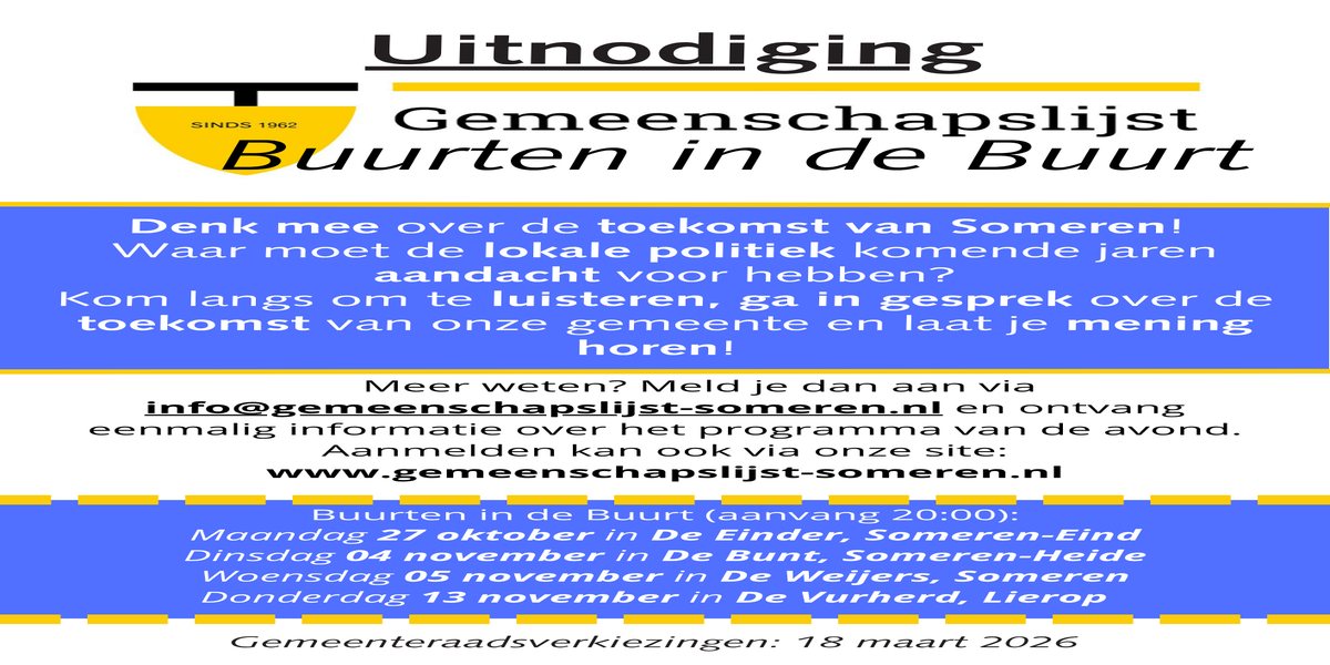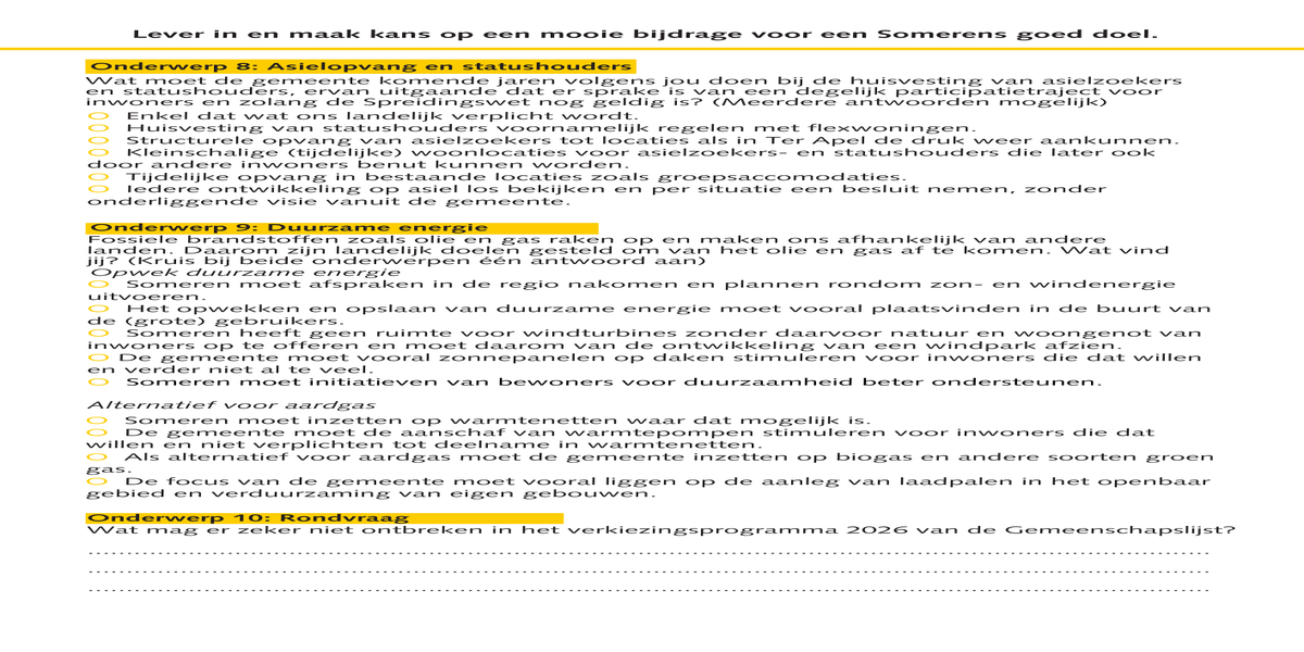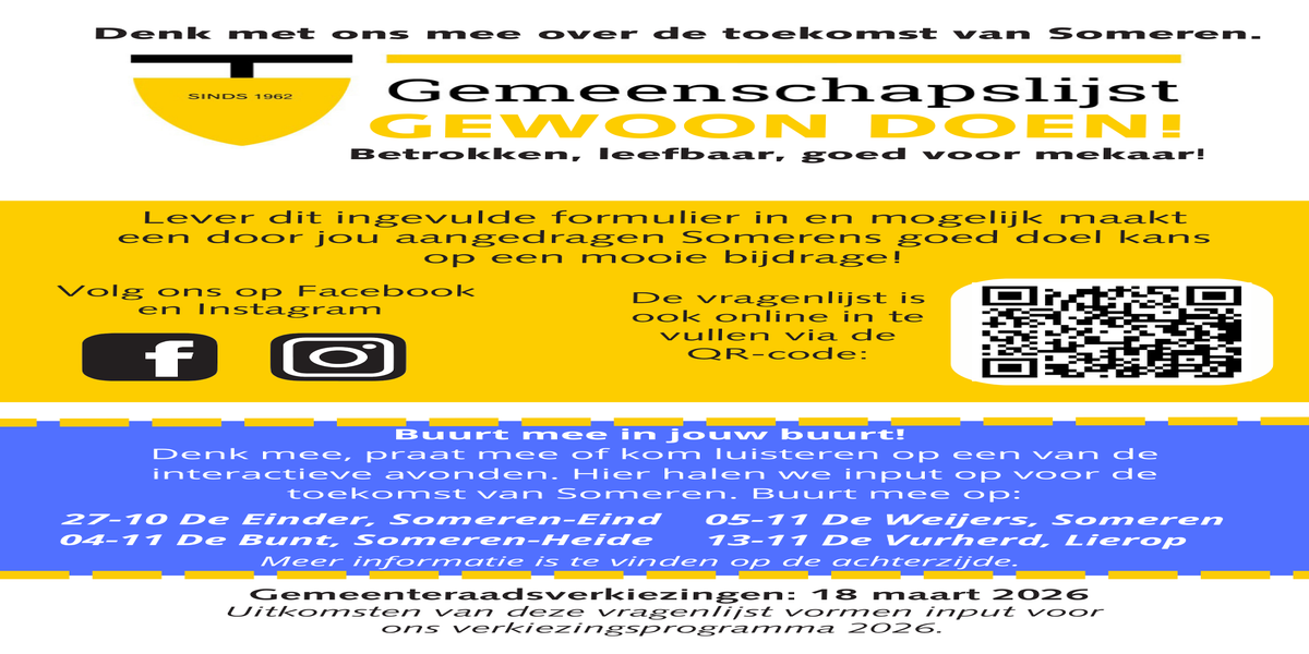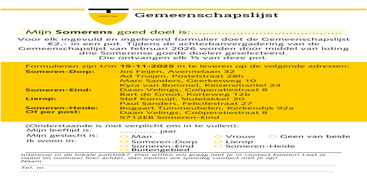 In oktober zal iedere inwoner van de gemeente Someren een flyer van de Gemeenschapslijst-Someren in de brievenbus krijgen. De flyer bevat een vragenlijst, waarmee de Gemeenschapslijst input op wil halen voor haar verkiezingsprogramma voor de gemeenteraadsverkiezingen van 2026. De ingevulde flyers kunnen op verschillende adressen in de gemeente worden ingeleverd. Ook kan er een Somerens goed doel worden ingevuld. Voor iedere ingevulde flyer doet de Gemeenschapslijst-Someren €2,- in een pot, die wordt verloot onder drie ingevulde Somerense goede doelen.