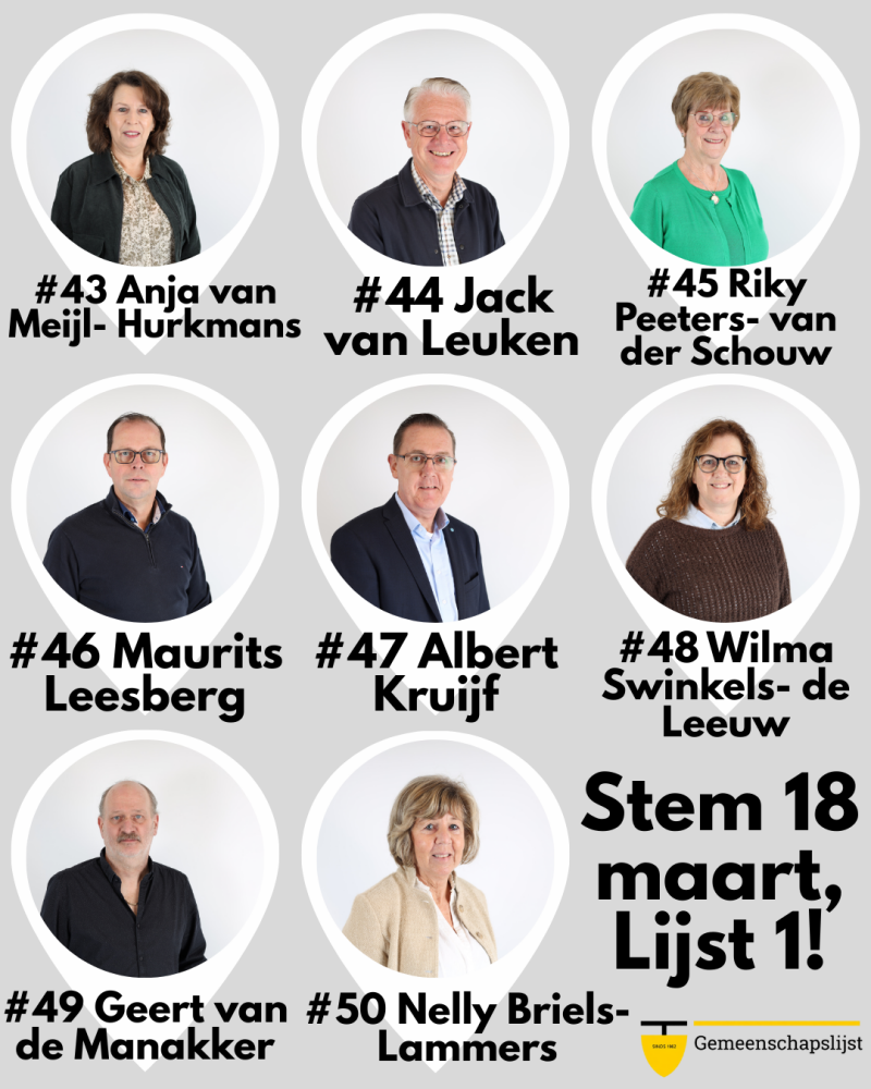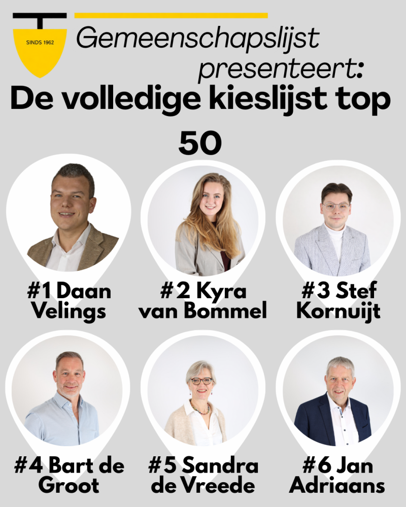 Richting de verkiezingen in maart 2026 zal de Gemeenschapslijst geleidelijk aan haar kieslijst vast gaan stellen en bekend gaan maken. Op 1 juli 2025 wordt eerst een lijsttrekker door de leden gekozen, in oktober stemmen zij over de verkiesbare plekken na een voordracht van het bestuur en in december zal vervolgens de hele kieslijst worden onthuld. Op deze pagina zal gedurende de komende maanden de kieslijst worden geplaatst zoals die tot dan toe is vastgesteld door de leden van de Gemeenschapslijst.